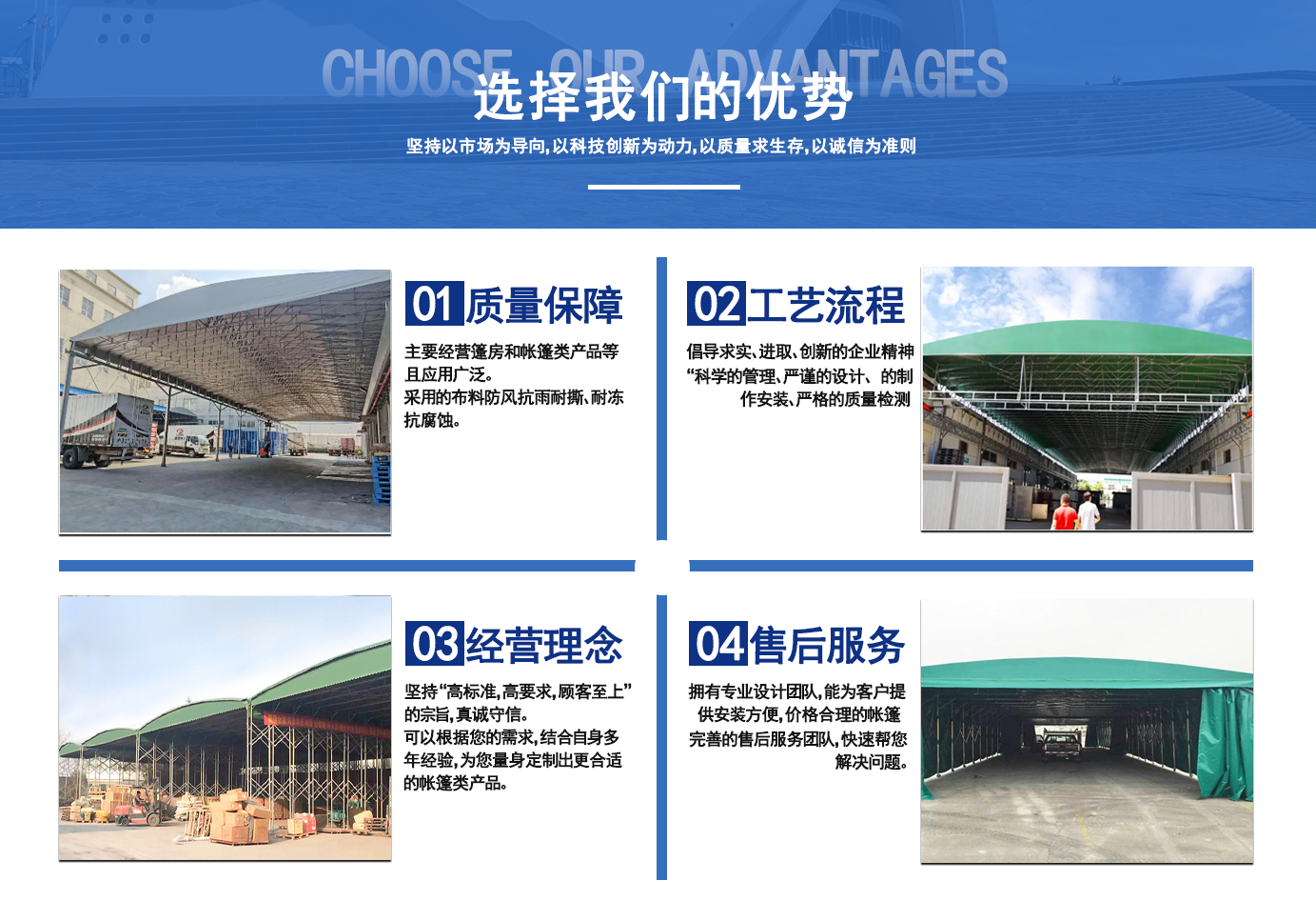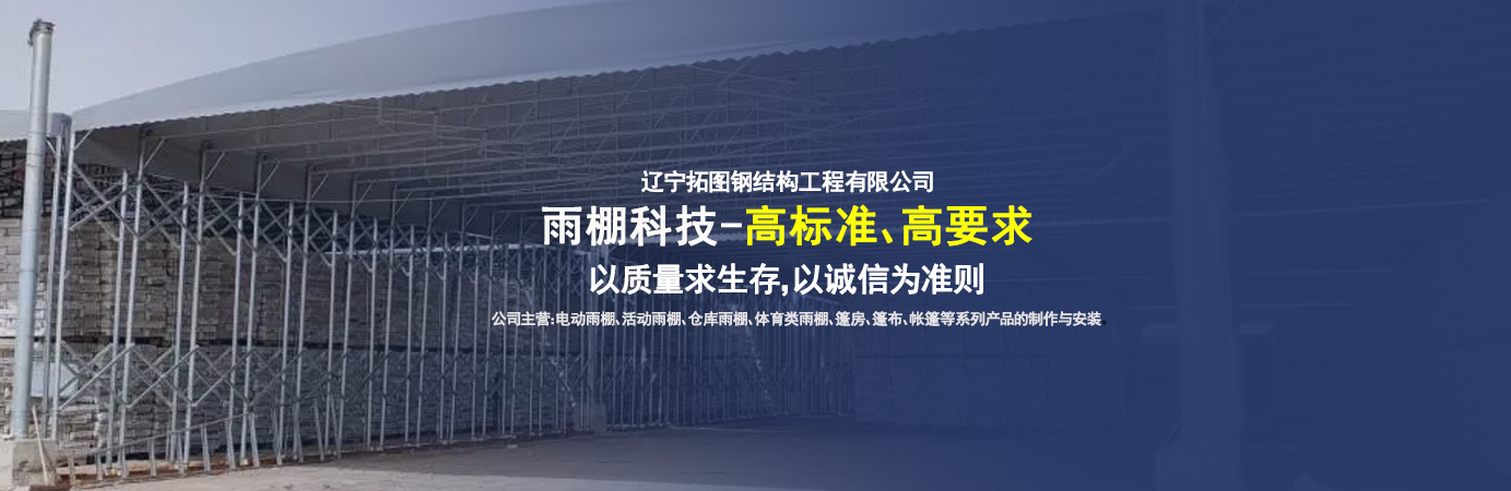 遼寧拓圖鋼結(jié)構(gòu)工程有限公司是一家專業(yè)從事推拉篷設(shè)計、制作、安裝、使用、維修的綜合性公司。公司主營:電動雨棚、活動雨棚、倉庫雨棚、體育類雨棚、篷房、篷布、帳篷等系列產(chǎn)品的制作與安裝。    遼寧拓圖鋼結(jié)構(gòu)工程有限公司堅持以市場為導(dǎo)向,以科技創(chuàng)新為動力,以質(zhì)量求生存,以誠信為準(zhǔn)則,倡導(dǎo)求實、進(jìn)取、創(chuàng)新的企業(yè)精神。“科學(xué)的管理、嚴(yán)謹(jǐn)?shù)脑O(shè)計、 的制作安裝、嚴(yán)格的質(zhì)量檢測、良好的后期服務(wù)成就企業(yè)的信譽,為您提供優(yōu)質(zhì)服務(wù)。    遼寧拓圖鋼結(jié)構(gòu)工程有限公司傾力于開發(fā)應(yīng)用三維空間結(jié)構(gòu)與新材料的結(jié)合,將廣告藝術(shù)視覺表現(xiàn)形式與張力膜材科學(xué)的結(jié)合,推出多彩推拉蓬,依靠先進(jìn)的科學(xué)技術(shù),將推拉蓬建筑表現(xiàn)形式無限延伸,立志走在建筑科學(xué)的前沿,引導(dǎo)建筑時尚潮流,我們的目標(biāo)是使推拉蓬建筑在中國發(fā)展壯大。    遼寧拓圖鋼結(jié)構(gòu)工程有限公司憑著極強的事業(yè)熱情和豐富的專業(yè)經(jīng)驗以“勤勉進(jìn)取、銳意創(chuàng)新、至誠至信”的精神使公司得到迅速健康發(fā)展,業(yè)務(wù)范圍遍及全國。科學(xué)的管理、嚴(yán)謹(jǐn)?shù)脑O(shè)計、高標(biāo)準(zhǔn)的制作安裝流程,嚴(yán)格把控產(chǎn)品質(zhì)量,熱誠的售后服務(wù)是企業(yè)競爭力的源泉。    遼寧拓圖鋼結(jié)構(gòu)工程有限公司人愿以最誠摯的態(tài)度,歡迎廣大客戶的蒞臨與溝通!愿為市場提供優(yōu)...